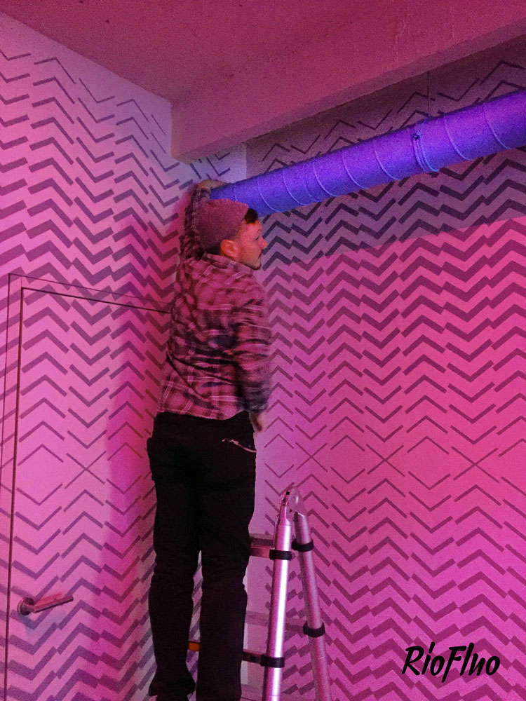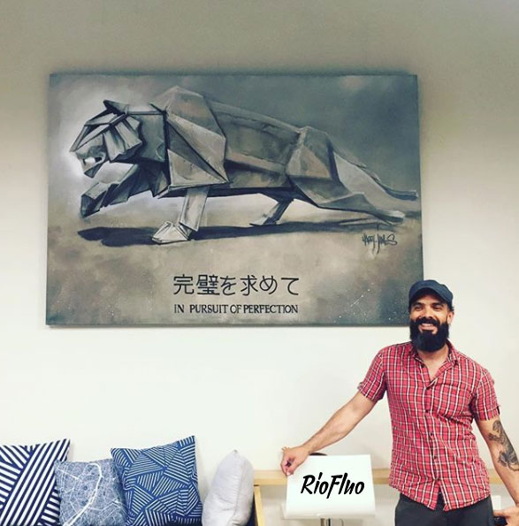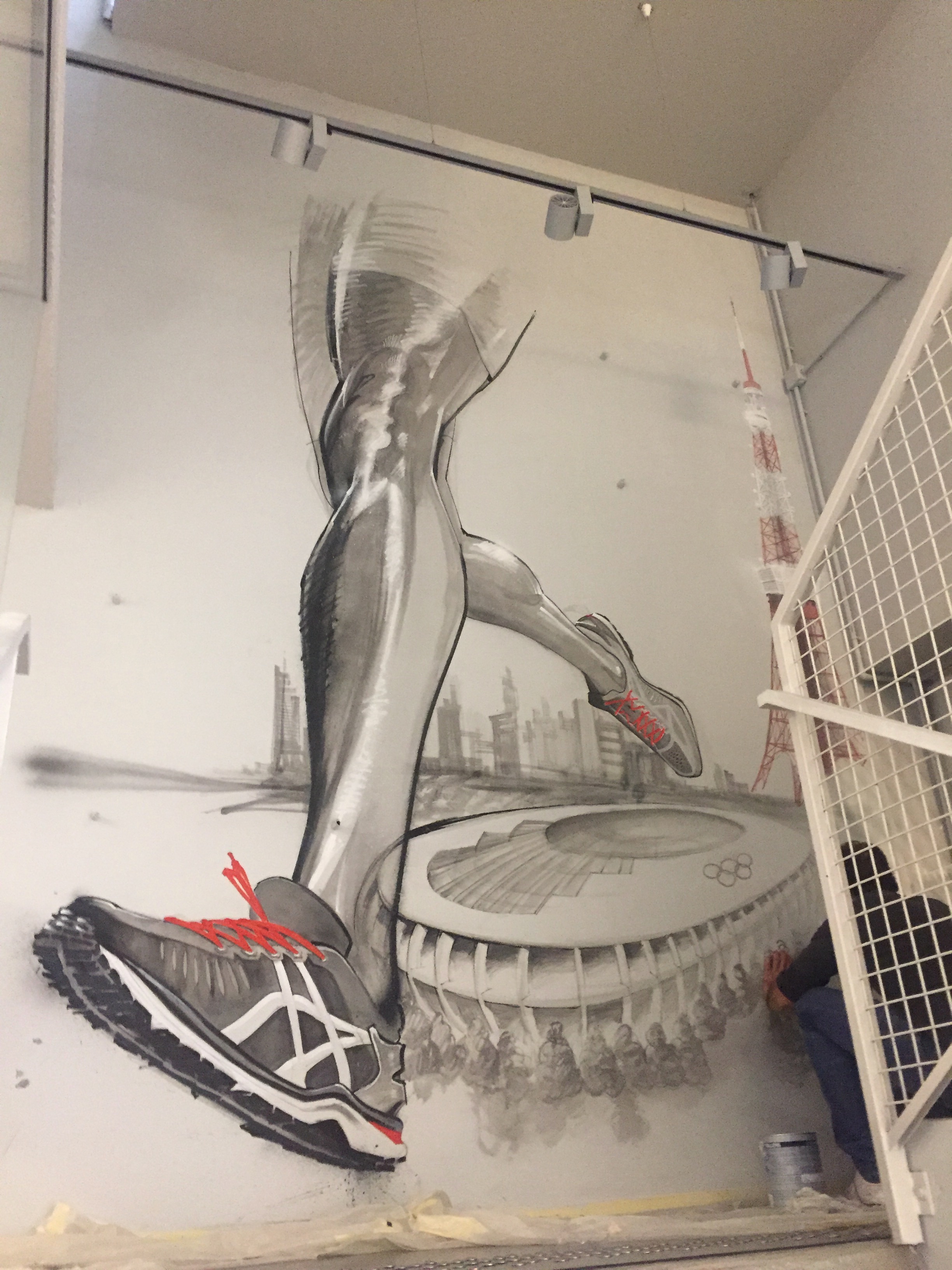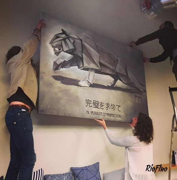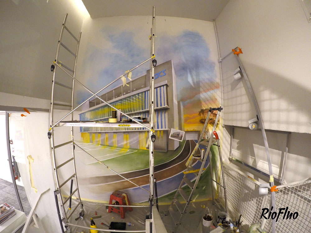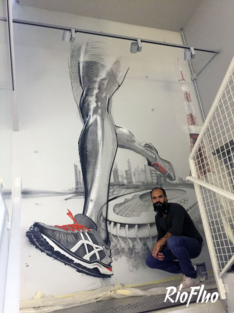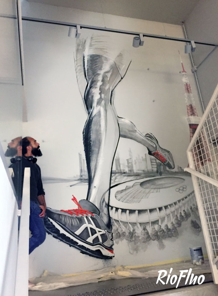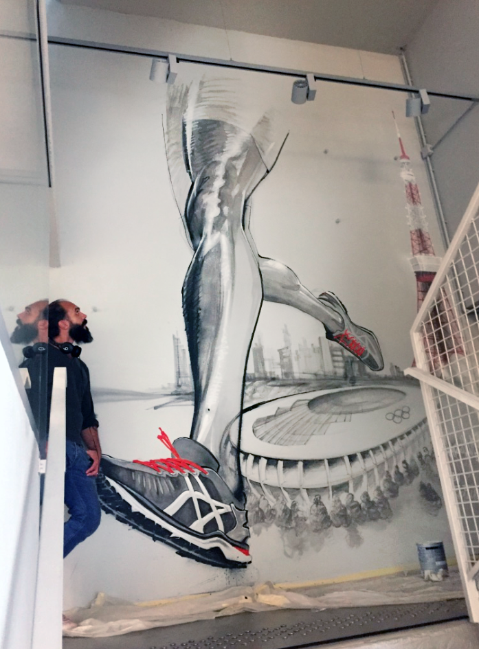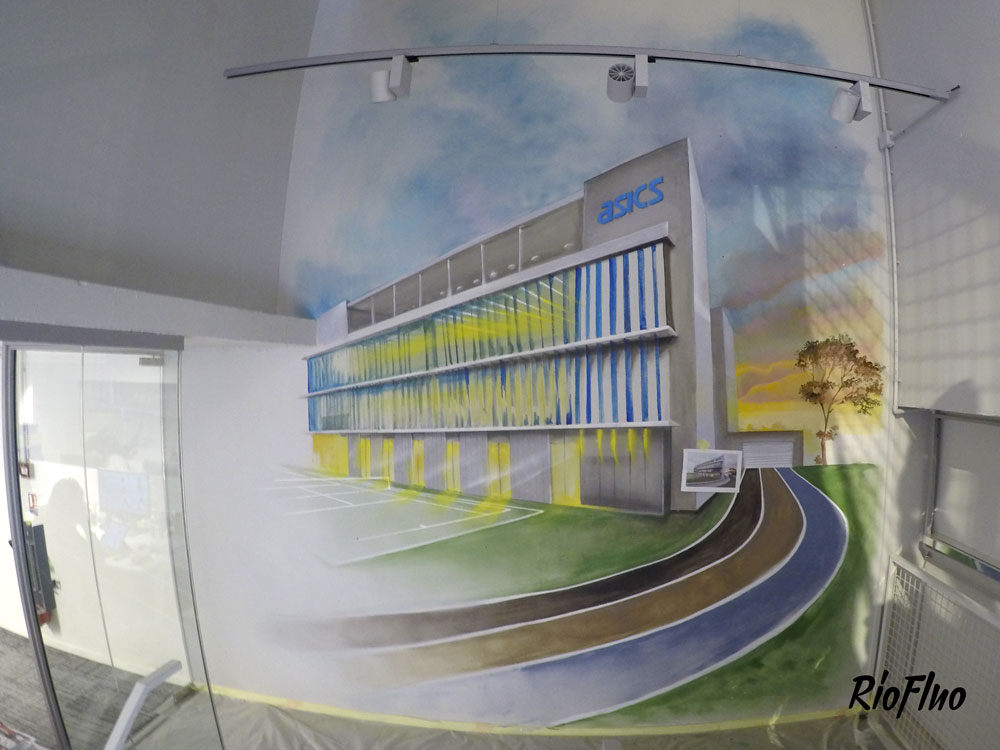 La marque réputée de sportwear a demandé à Riofluo de prendre en main la direction artistique des peintures murales de leur QG. Afin d’illustrer l’image de la marque japonaise et de connoter le style street et technique, nous avons proposé à l’artiste Harry-James de peindre les murs qui desservent les étages avec un style figuratif et dynamique, présent aussi dans la salle de vie. Le Gymroom a quant à lui été personnalisé par l’artiste Alex Pariss, spécialiste d’art optique, le but étant ici de jouer avec l’appréhension de l’espace.