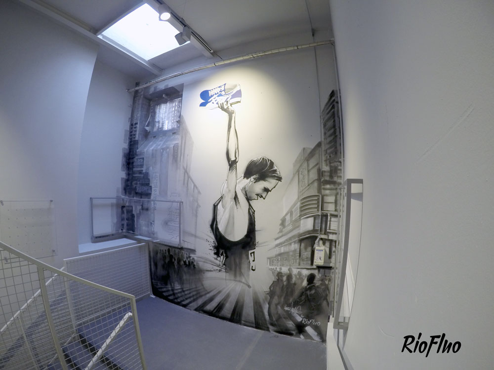 La marque réputée de sportwear a demandé à Riofluo de prendre en main la direction artistique des peintures murales de leur QG.