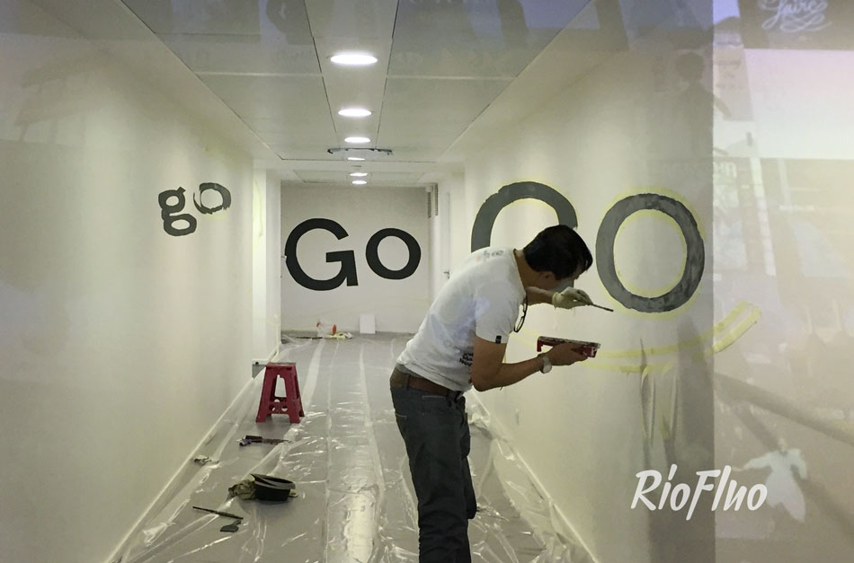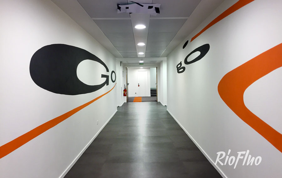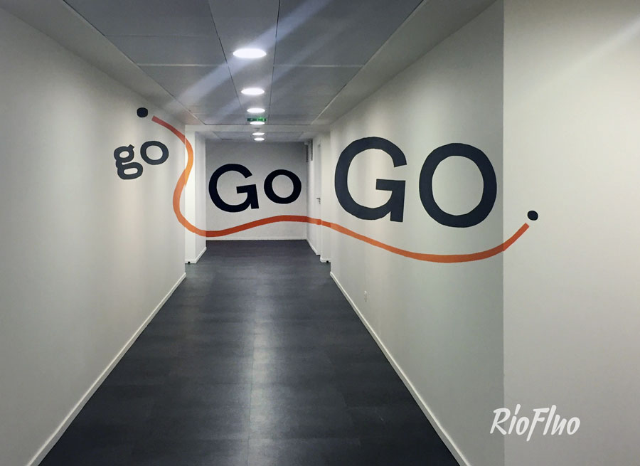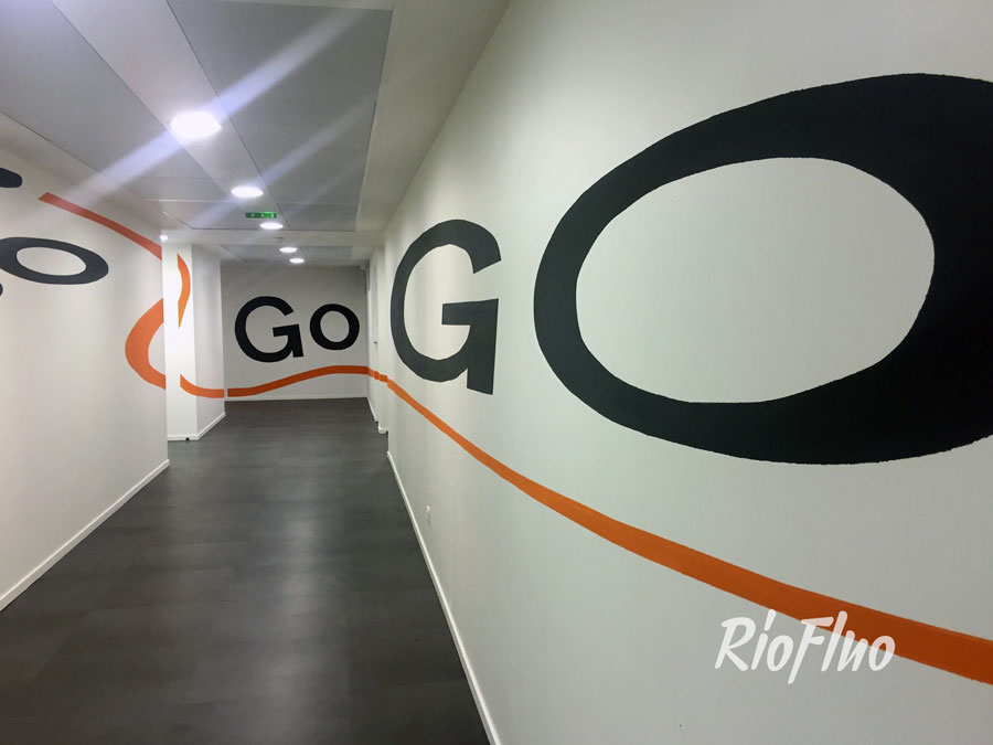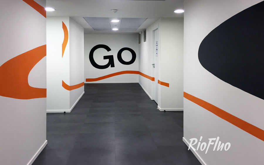 Riofluo a proposé la réalisation d’une anamorphose reprenant les codes chromatiques et graphiques de l’entreprise, de 30 mètres de long sur 3 murs différents.