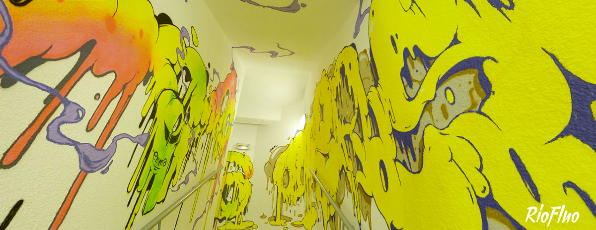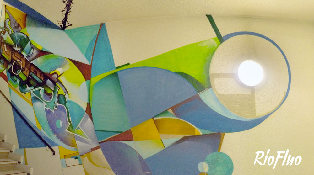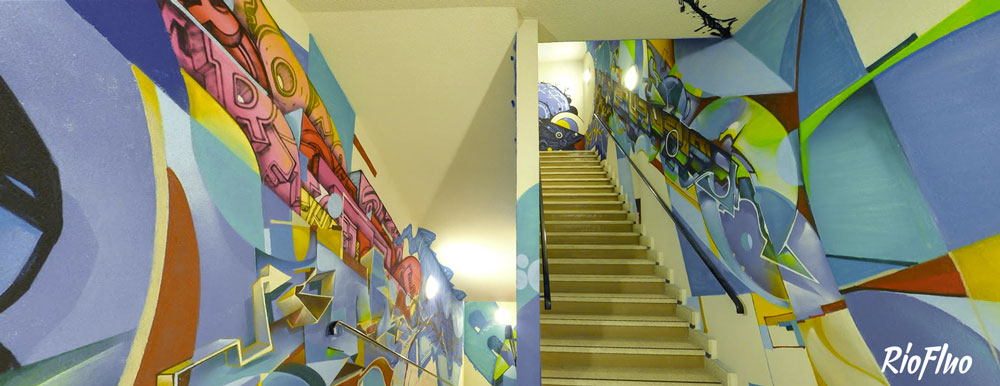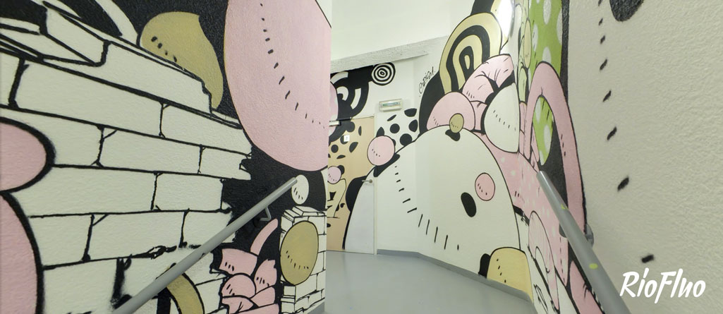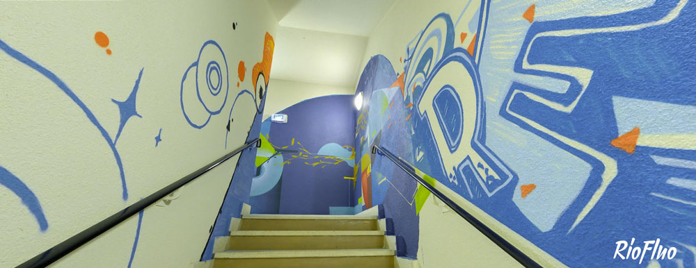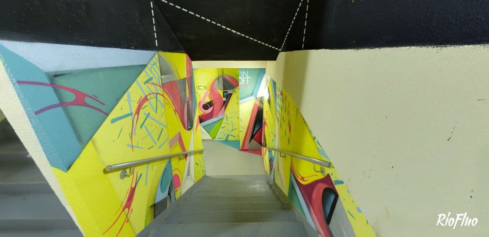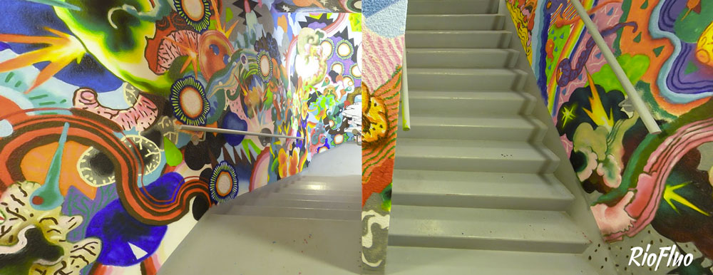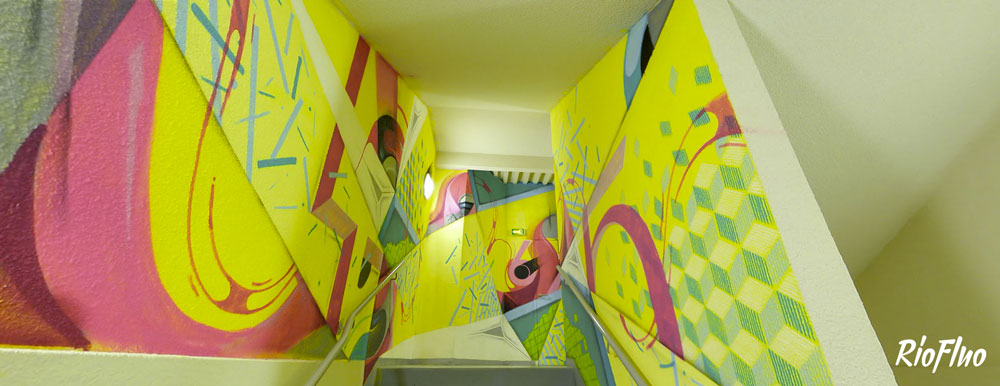 Dans l’objectif de désengorger les ascenseurs et de rendre plus attractif les escaliers, RioFluo a proposé une déambulation, dans les cages d’escaliers, racontant les 4 mouvements principaux du graffiti.
