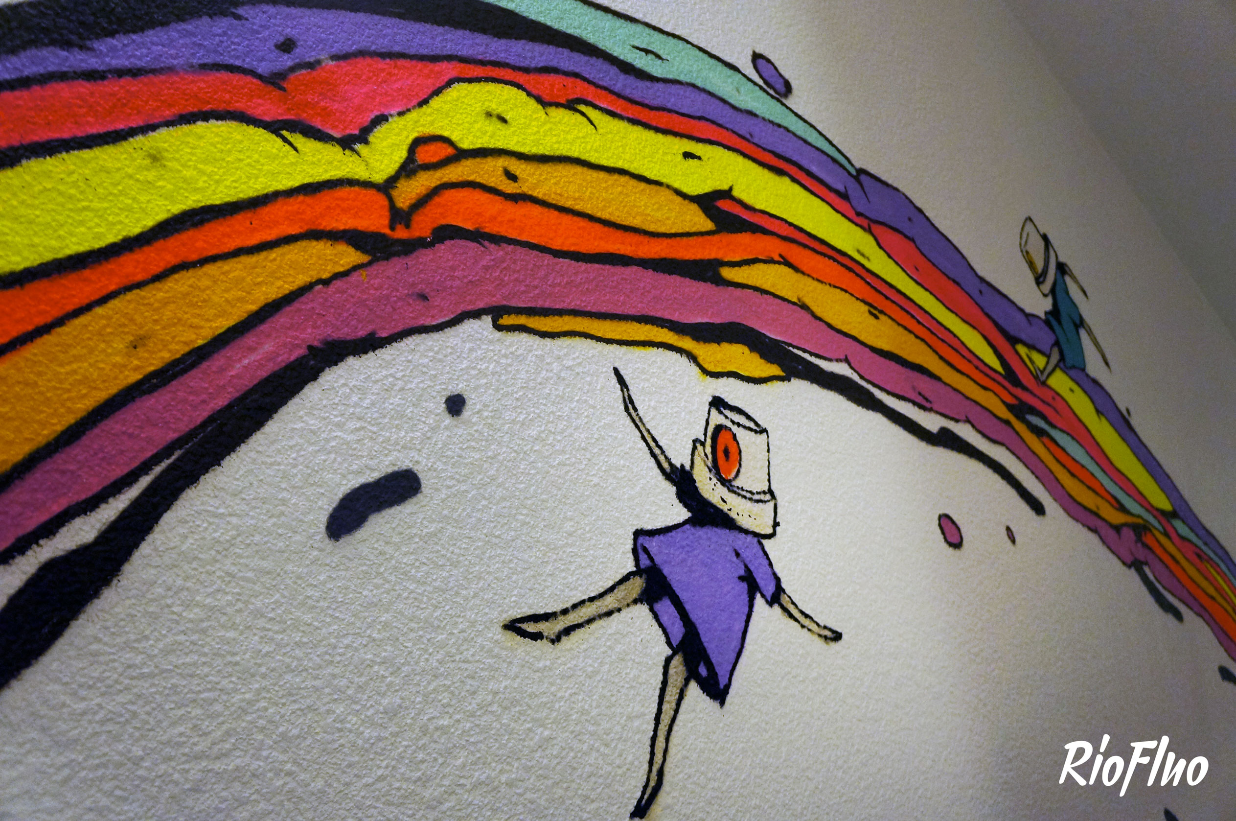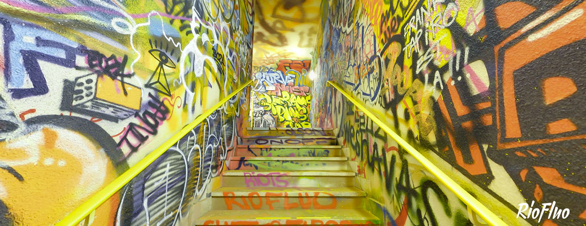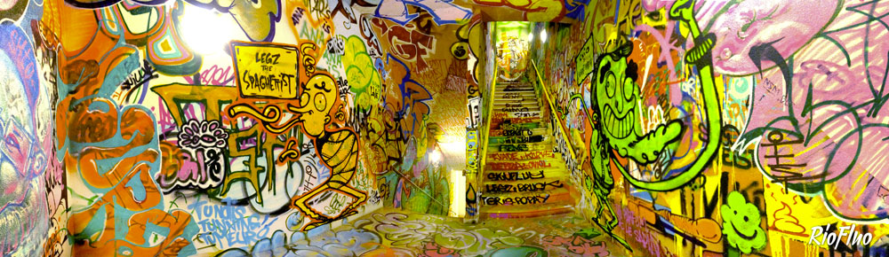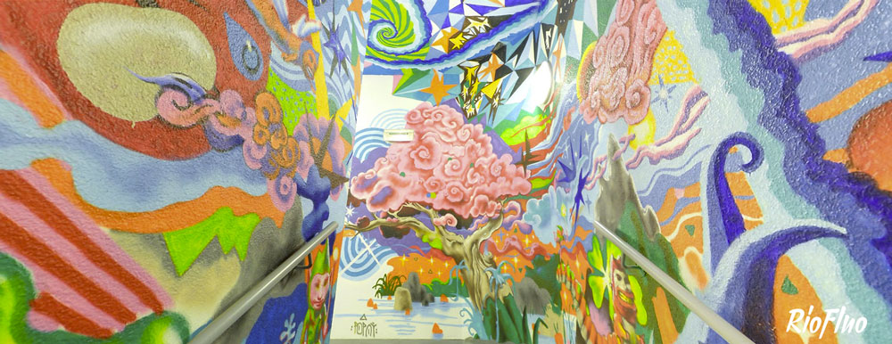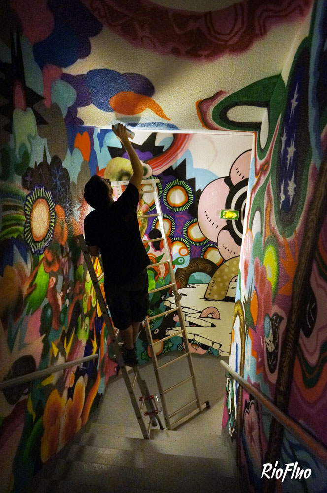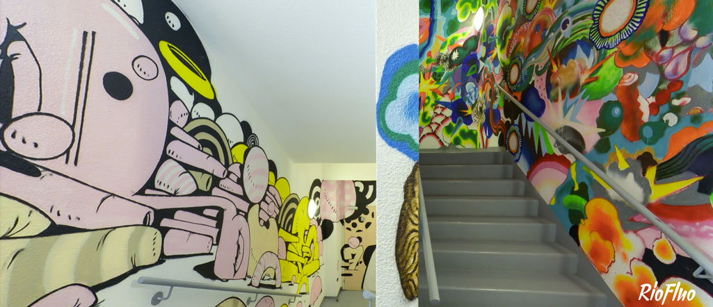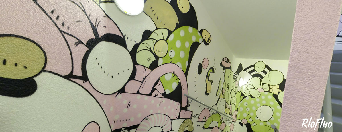 Dans l’objectif de désengorger les ascenseurs et de rendre plus attractif les escaliers, RioFluo a proposé une déambulation, dans les cages d’escaliers, racontant les 4 mouvements principaux du graffiti.