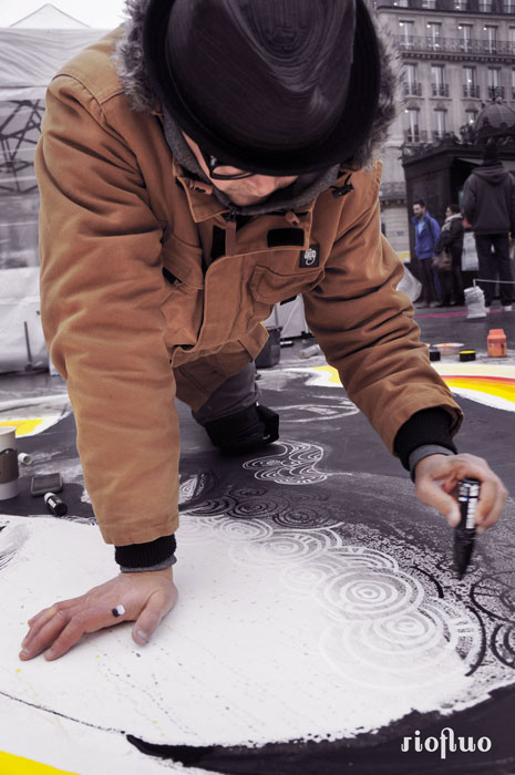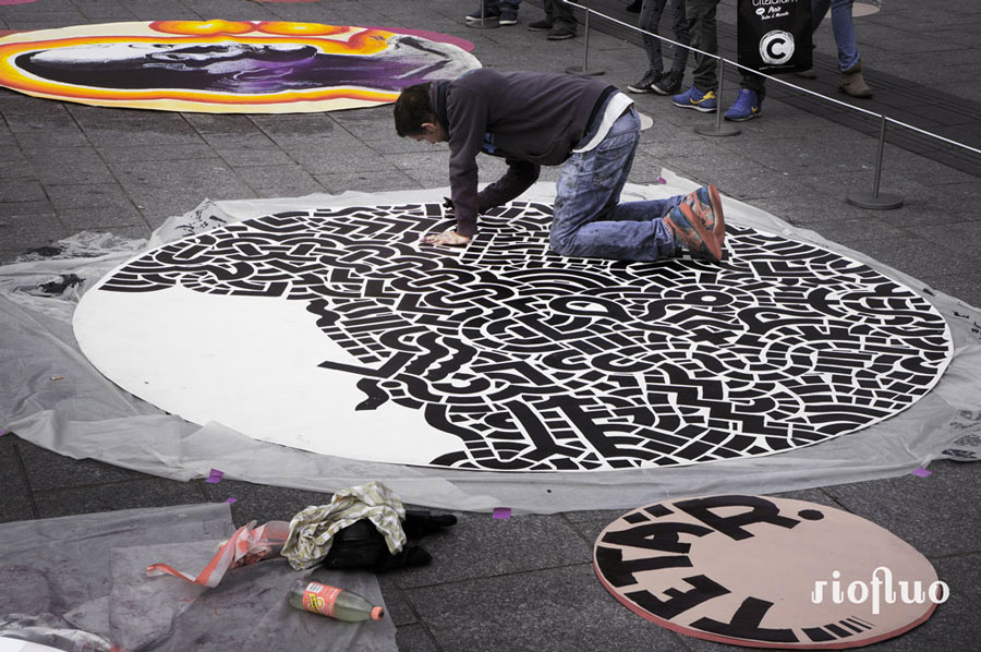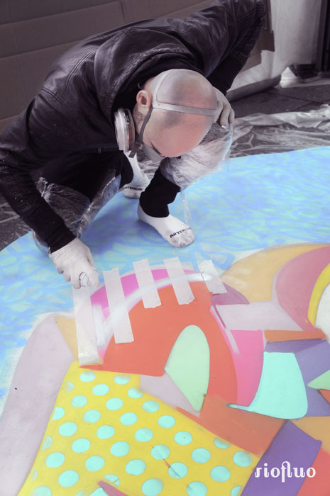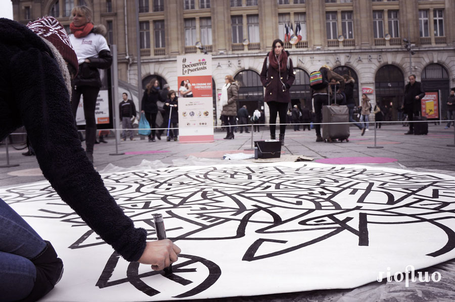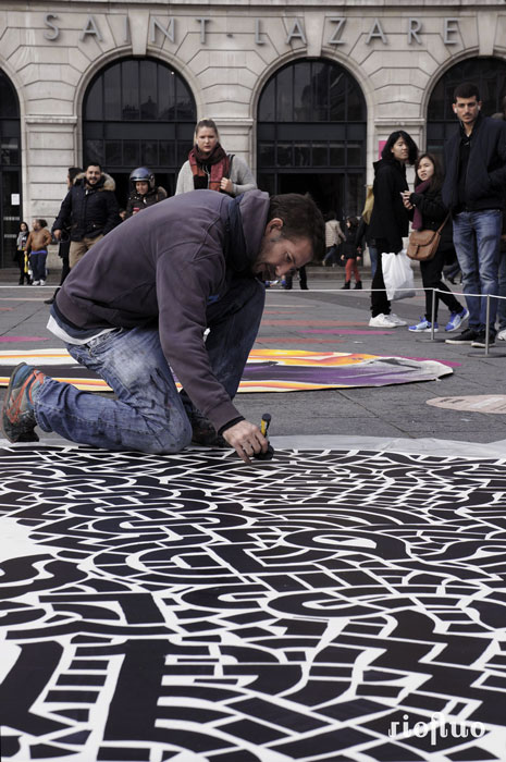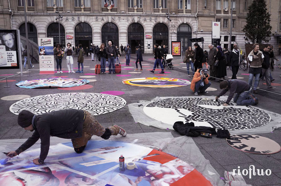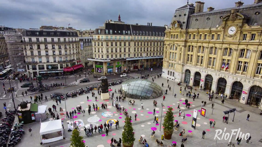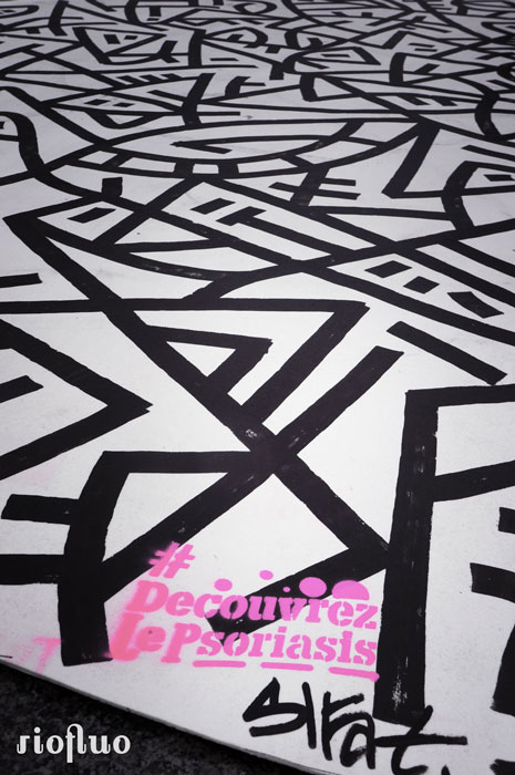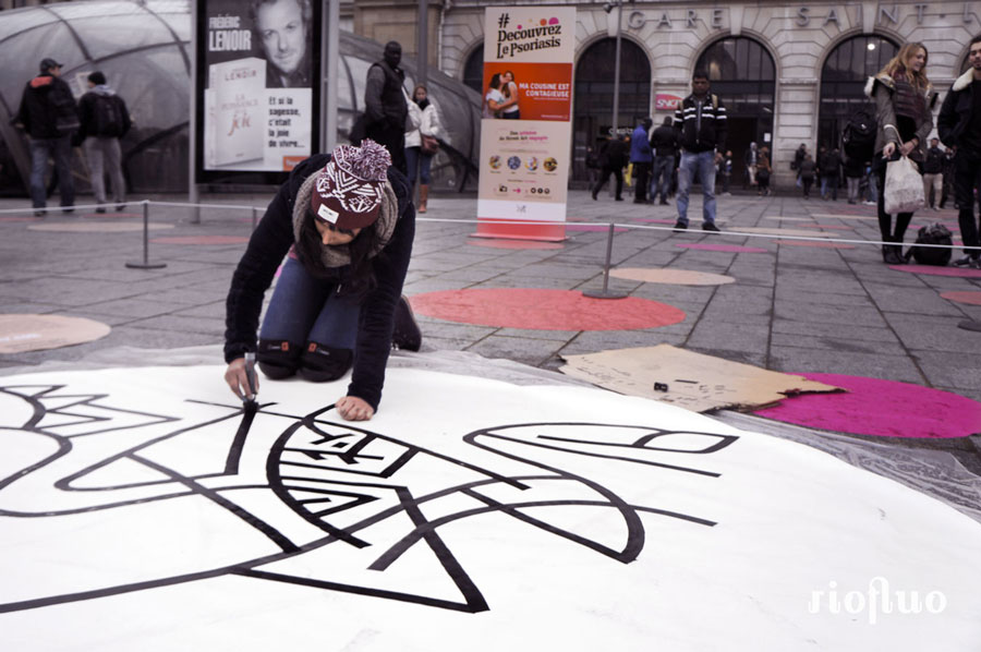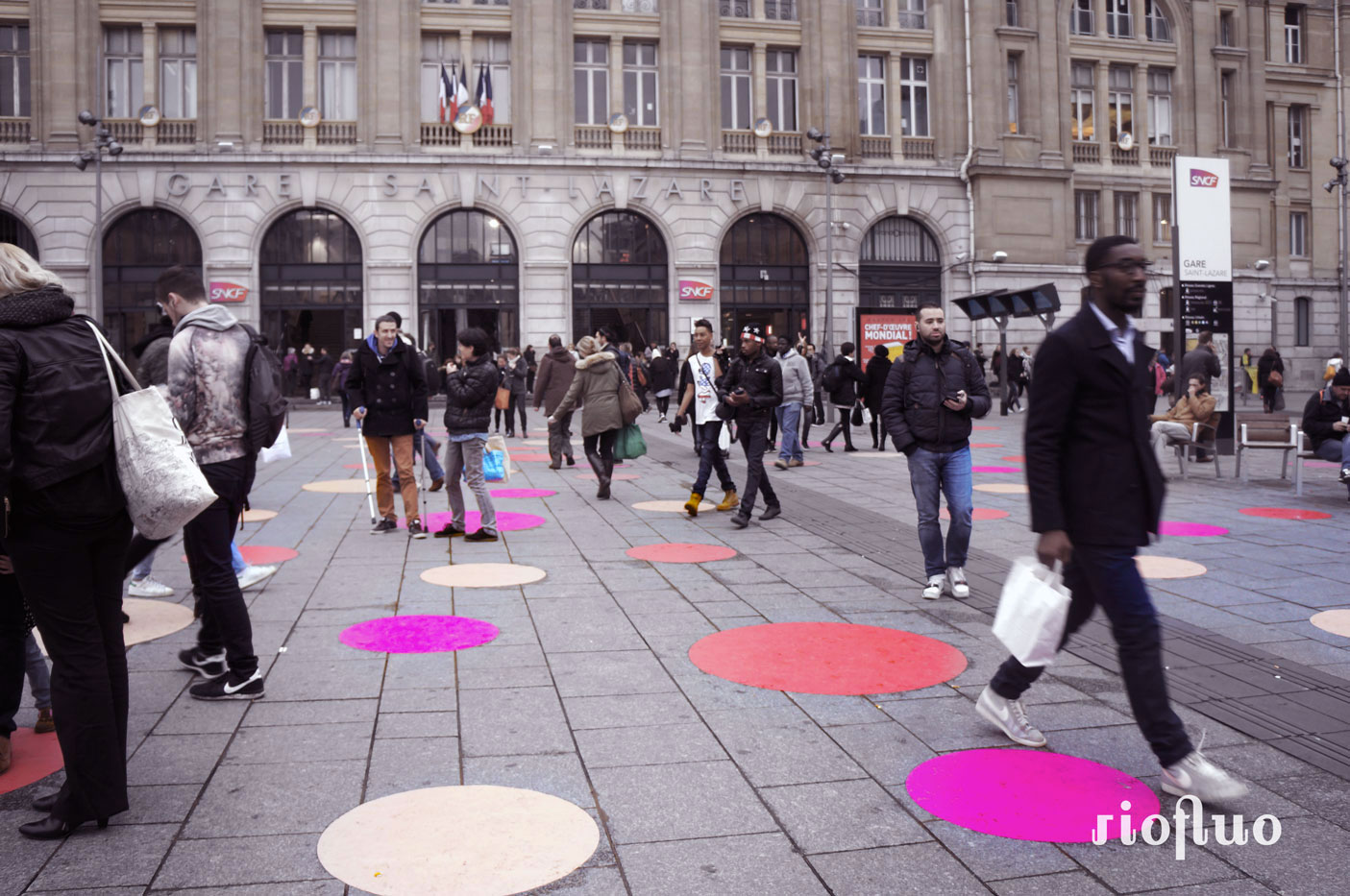 RioFluo a conçu une intervention artistique sous la forme d’un hacking de l’espace public ; l’irruption soudaine de pastilles de couleurs recouvrant le parvis de la Gare St Lazare pour symboliser l’apparition souvent rapide et imprévisible de la maladie et l’accumulation des cellules de la peau se développant exponentiellement.