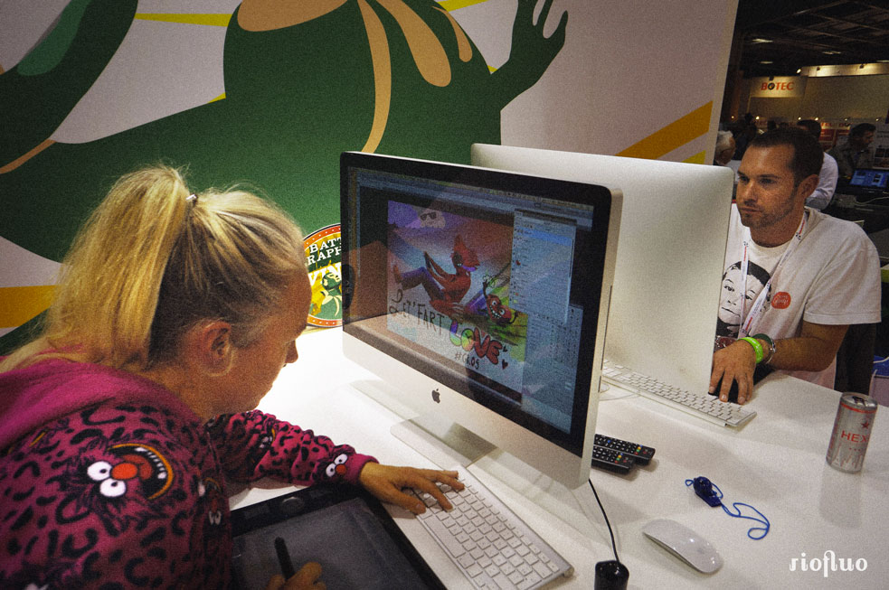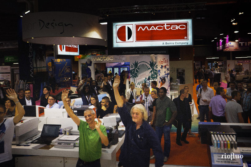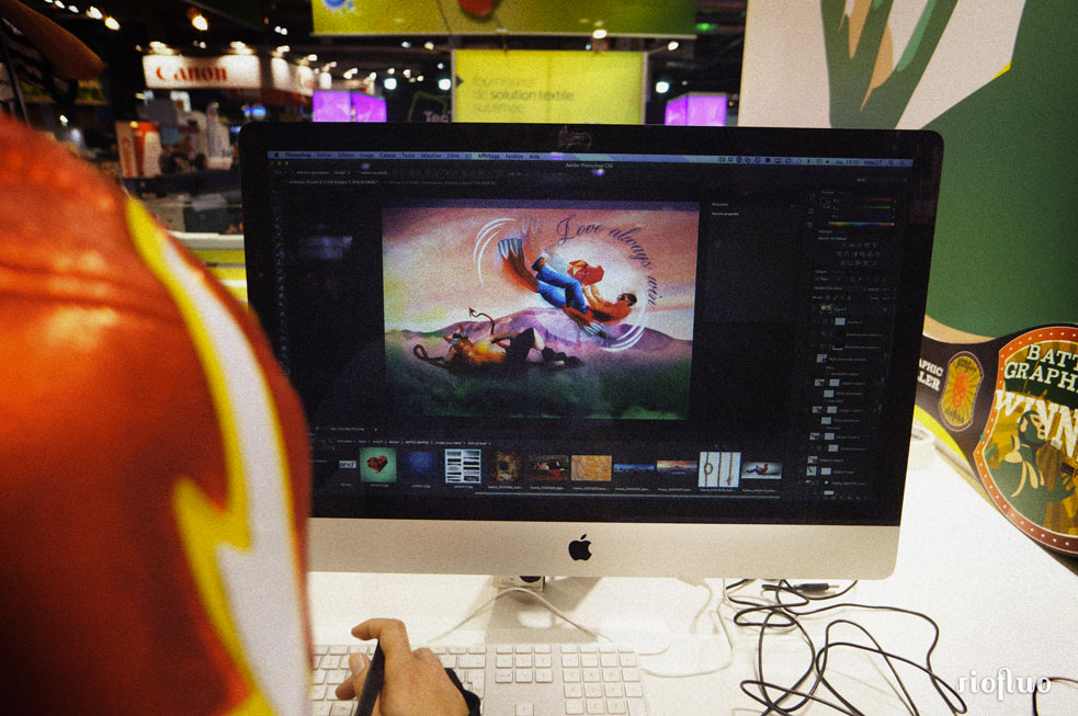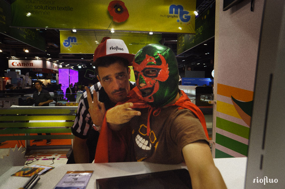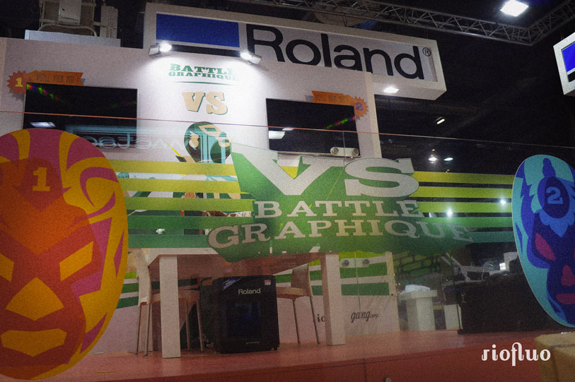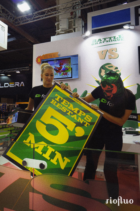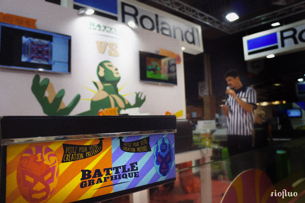 Afin de rendre plus spectaculaire, ludique et attractif le stand de la marque et leurs produits, Riofluo a créé un show ludique et technique mettant en avant la création graphique et numérique. Des graphistes se sont «confrontés» en créant, dans un temps limité avec la même banque d’images, le plus beau visuel. Grâce à une retransmission sur 2 écrans, le public était invité à voter durant chaque battle pour sa création préférée et repartait avec le visuel imprimé sur place sur le support de son choix.