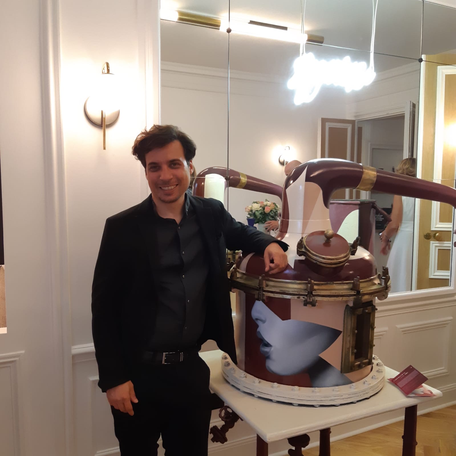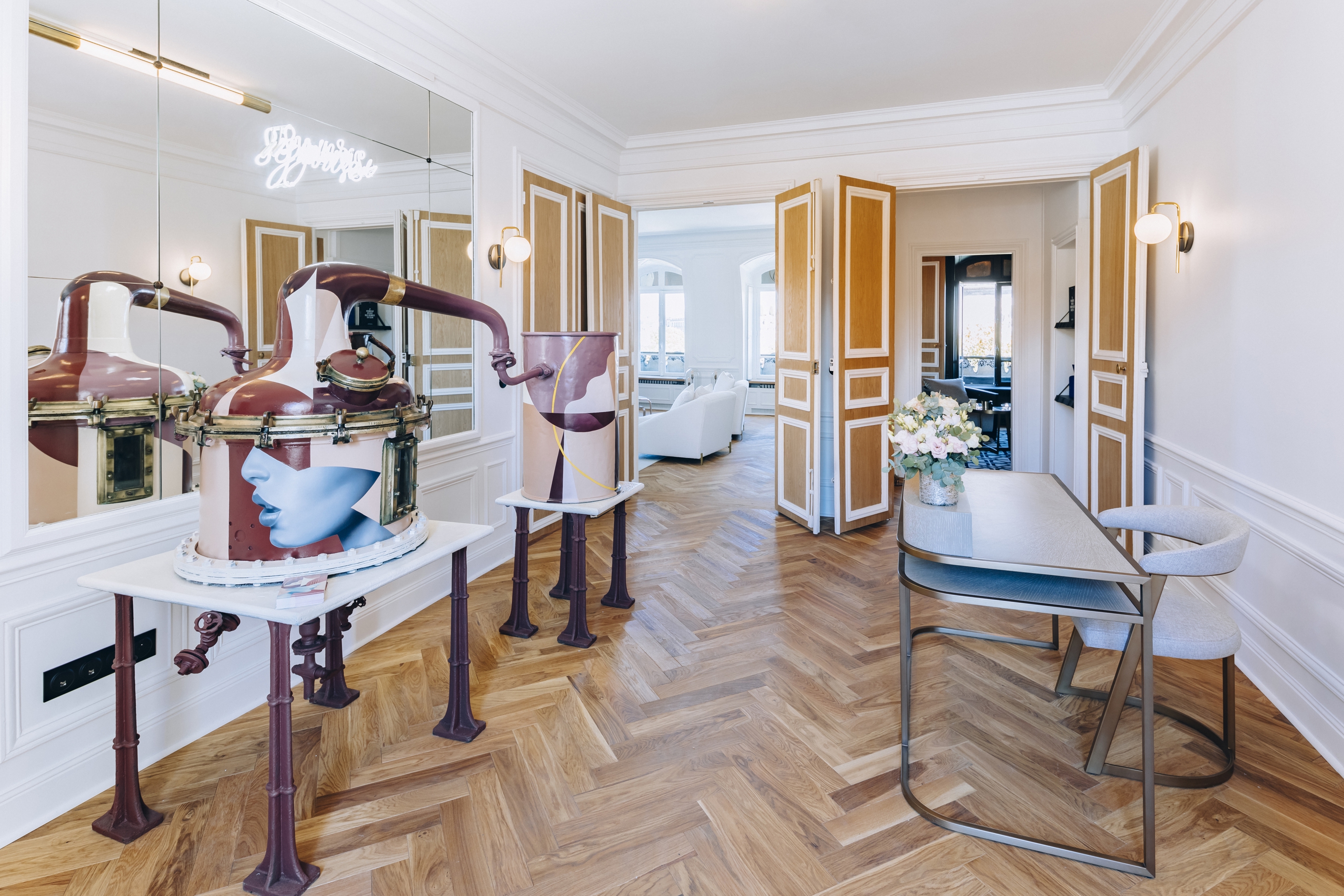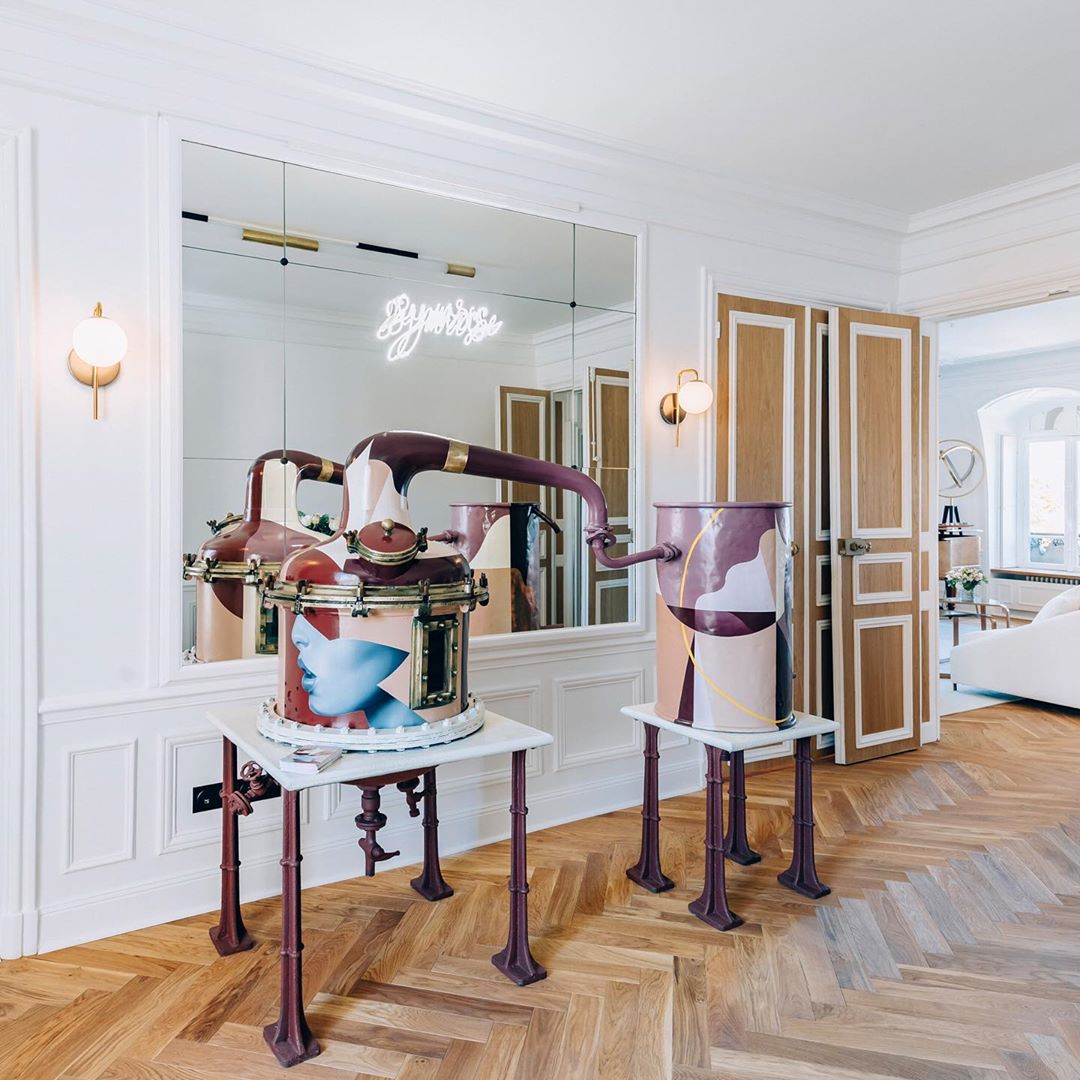 Pour la décoration de leur nouveau showroom « Appartement étoile » devant l’arc de triomphe. La grande maison de parfum Symrise a fait appel à Riofluo afin de proposer l’artiste Skio pour la customisation d’un alambic et l’exposition de ces œuvres.