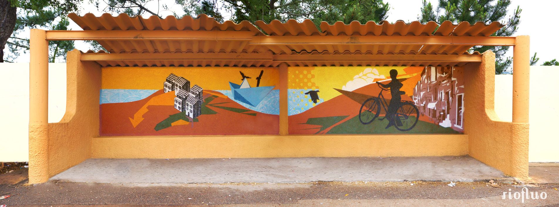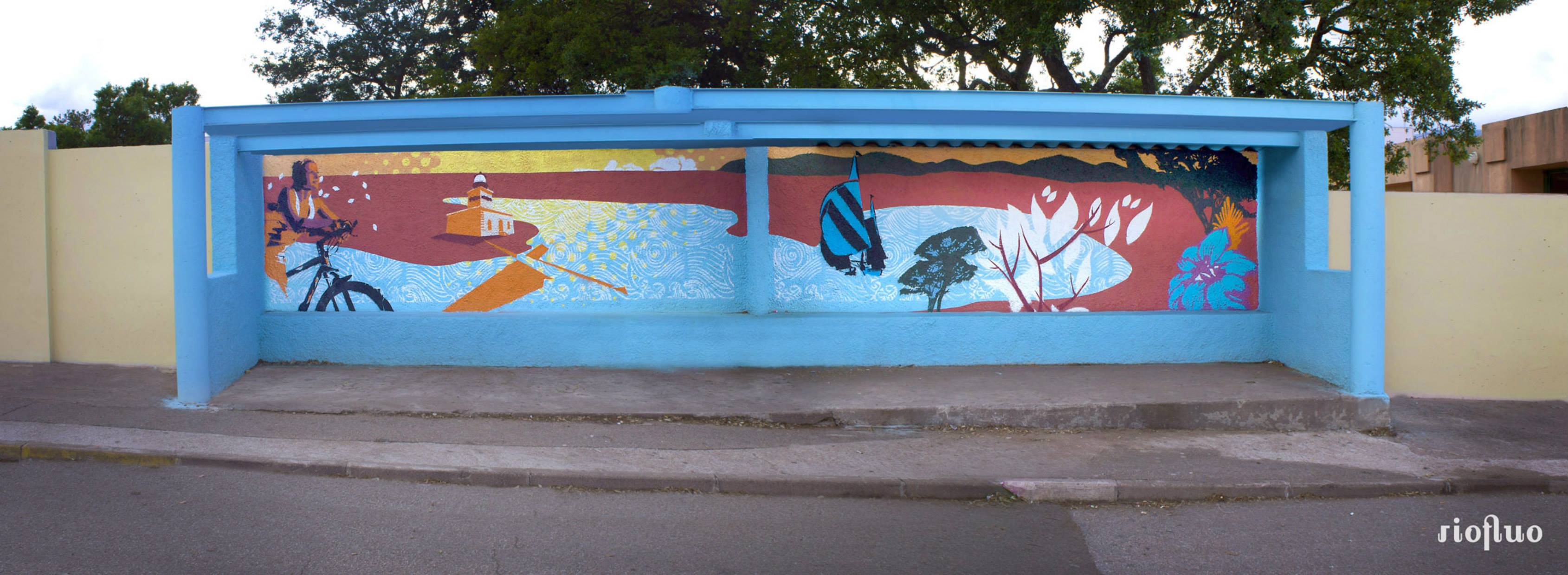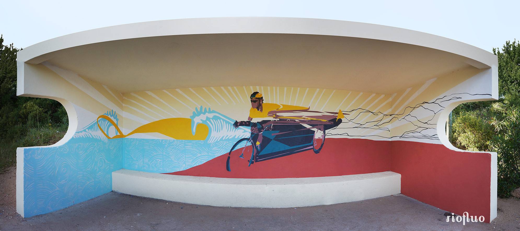 La ville de Porto-Vecchio, accueillant le départ de la 100ème du Tour de France de cyclisme, a mandaté Riofluo afin de rénover et embellir ses abribus et de créer en parallèle des ateliers d’initiation au Street-art avec les collégiens de la ville. 7 jours de création pour un résultat à la hauteur des vœux de la mairie. La Corse nous a conquis aussi ! Abribus, Corse, Cyclisme, Tour de France, Méditerranée, Graffiti, Street-Art, participatif, sport, pochoirs, réhabilitation.