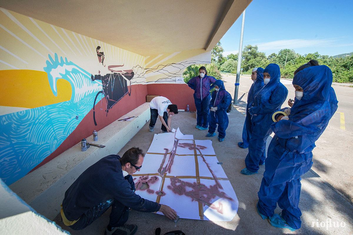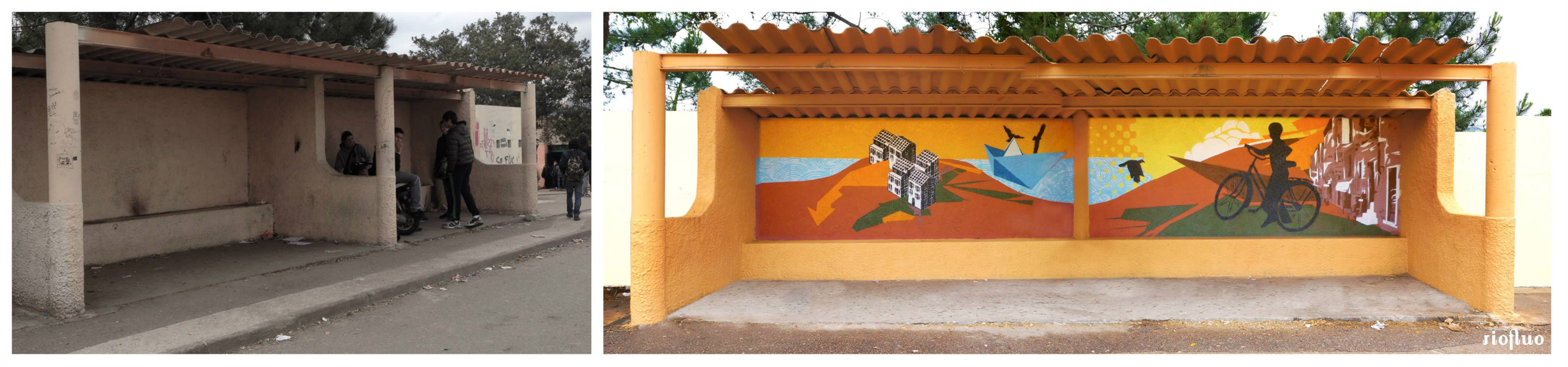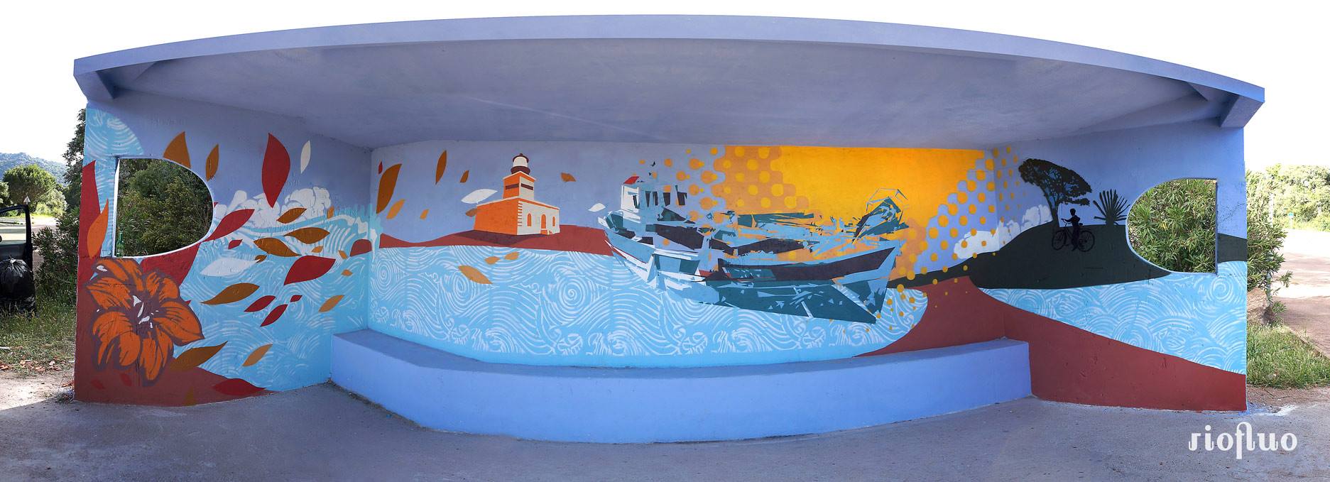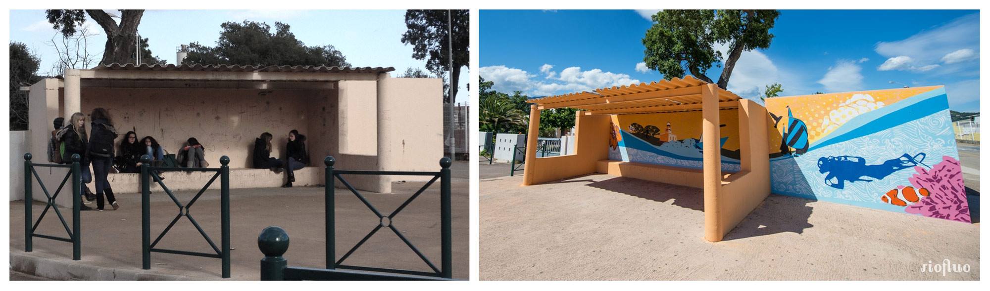 La ville de Porto-Vecchio, accueillant le départ de la 100ème du Tour de France de cyclisme, a mandaté Riofluo afin de rénover et embellir ses abribus et de créer en parallèle des ateliers d’initiation au Street-art avec les collégiens de la ville.